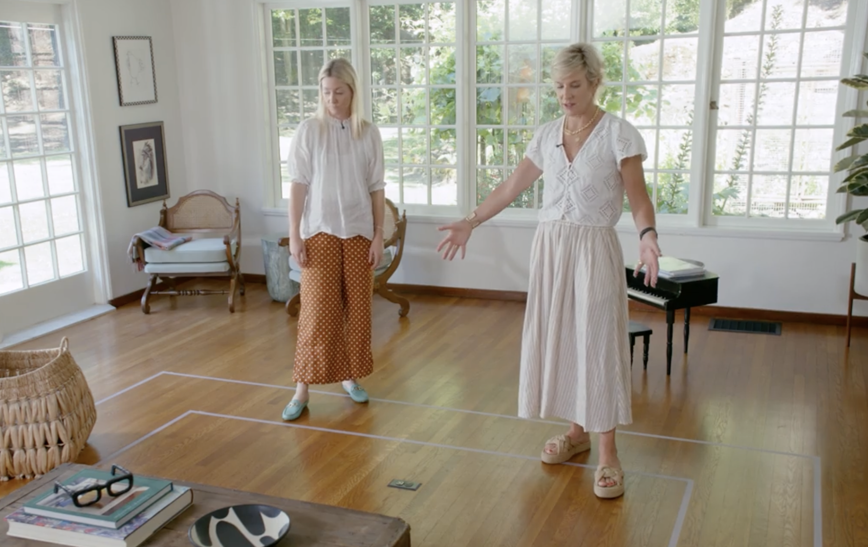 Taping out the living room at Westward Tudor before purchasing furniture.
